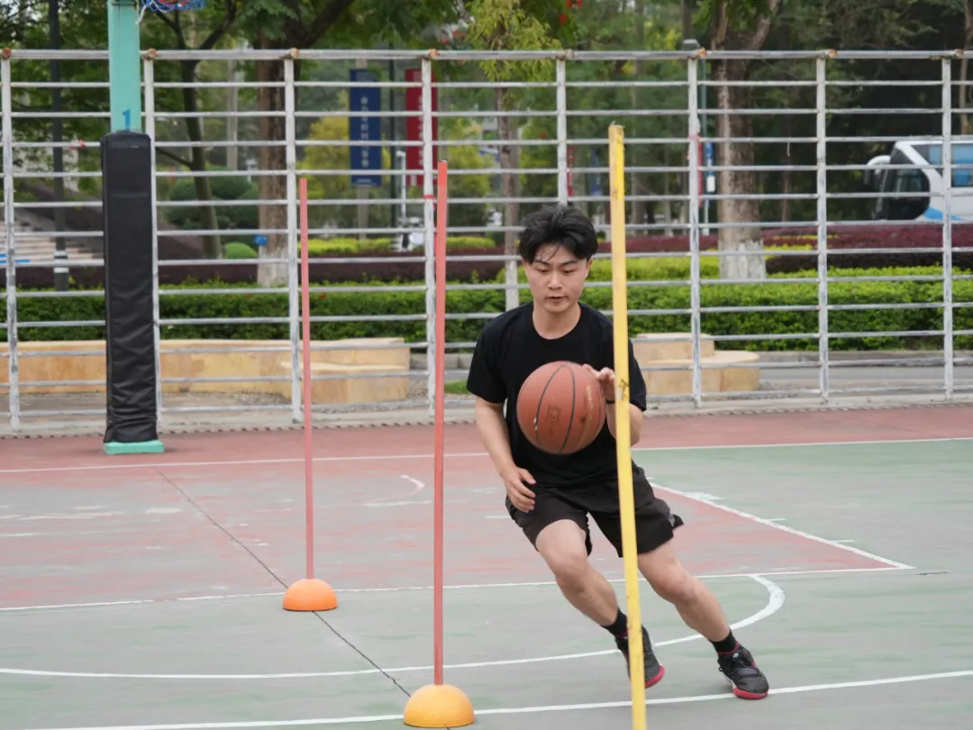 运球绕杆上篮中,挑战者们按“S”型方向,单手运球往前依次过4排标志杆,返回时再依次过4排标志杆。
