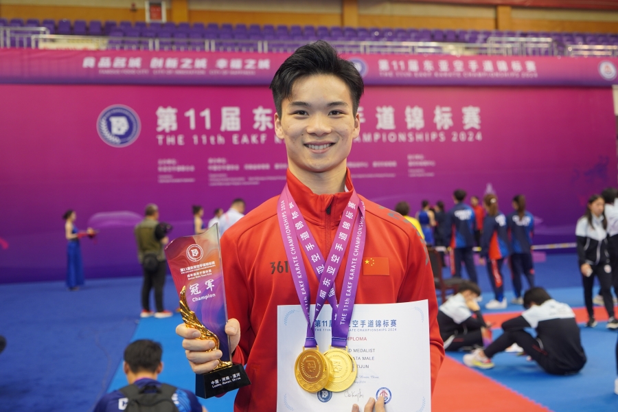 5月10日至12日,第十一届东亚空手道锦标赛在河南漯河体育馆举行。本次比赛是东亚地区年度最高级别赛事,也是中国空手道协会2024年度国际赛事参赛任务之一。我校体育学院2023级运动训练专业空手道专项学生何梓俊在比赛中夺得“U21男子个人型”冠军与“成年组团体型”冠军两枚金牌,展现了我校学子拼搏向上的体育风采,在国际赛事舞台上为国争光、为校添彩。
