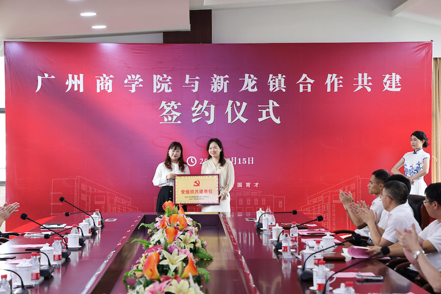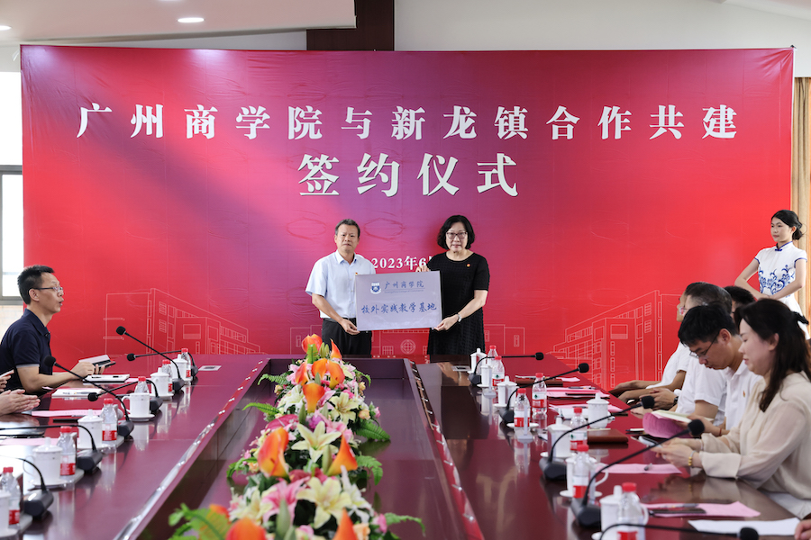 6月14日上午,我校与新龙镇在学术交流中心举行合作共建签约仪式。黄埔区委常委、新龙镇党委书记邓奕中,黄埔区委组织部副部长杨灿,黄埔区委组织部三处处长钟晓东,新龙镇人大主席林悦群,党委副书记王劲,人大副主席钟晓青,四级调研员施文亮,党建工作和社会事务综合服务工作相关同志,我校校长马蔚兰,党委书记唐明勇,执行校长尹睿,校党委委员、副校长何柏略,相关职能部门负责人,数字经济产业学院和管理学院教师代表参加活动。省委教育工委主题教育第七巡回指导组组员吴楚洲到场指导。仪式由何柏略主持。