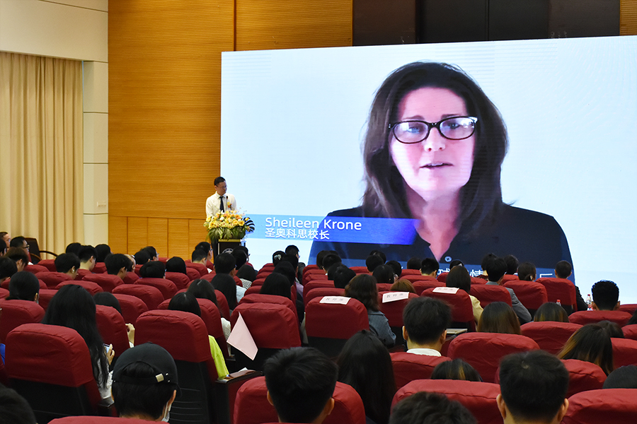 加拿大联邦政府国会议员Han Dong及加拿大圣奥科思校长Sheileen Krone作为合作方代表分别通过视频致辞的方式表达了对圣奥科思国际项目顺利开展的祝贺。他们对加拿大的教育水平及圣奥科思课程特点做了简单的介绍,并向有意愿参加圣奥科思国际项目的同学发出邀请,希望同学们能到校本部参观考察,选择合适自己的本地课程或离岸课程和高质量的学习服务。