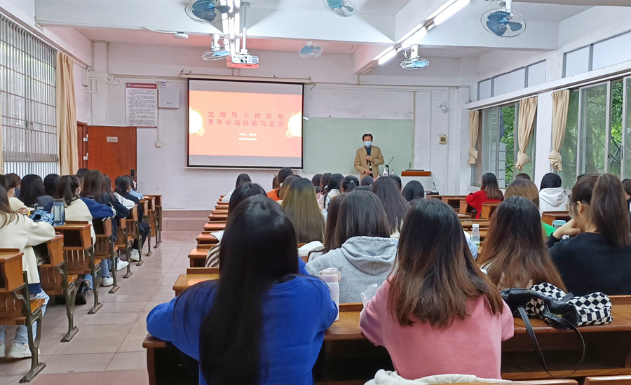 吕泉荣以“党领导下的百年青年运动史”为主题,给英语2005、2006班学生讲解了百年以来党领导下青年运动的历史和不同时期青年运动的特征与成就,启发学生思考当代青年如何吸取前辈的信仰力量和精神,自觉成为能够立大志、明大德、成大才、担大任的时代新人,实现中华民族伟大复兴。