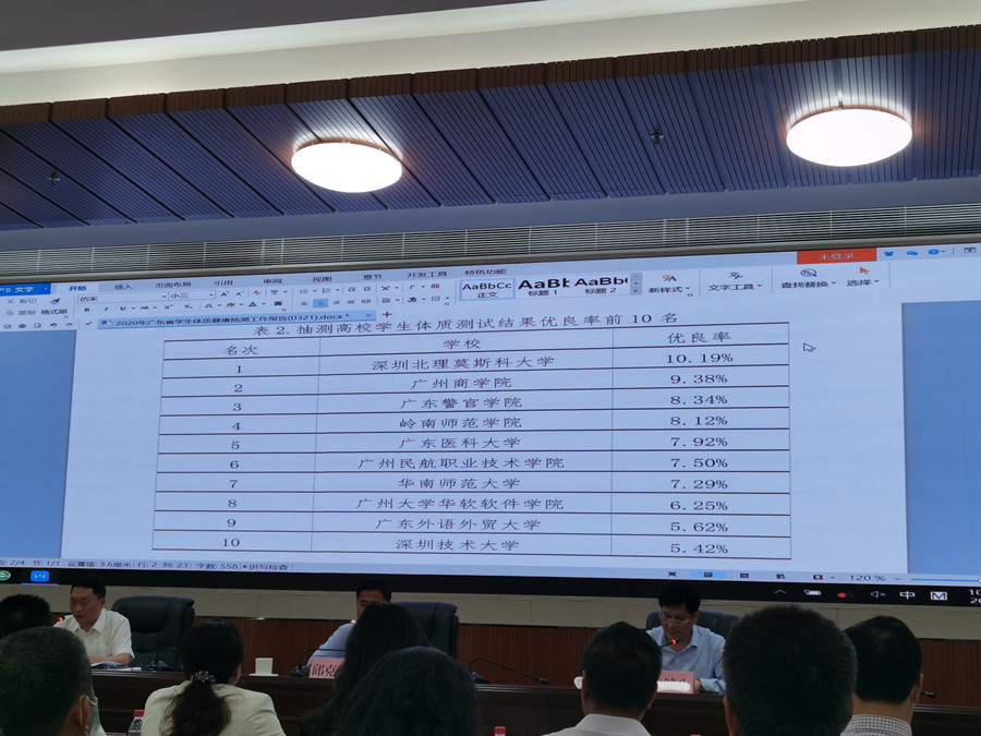 会上,广东省教育厅总结了2020年广东省体质健康抽测工作情况,公布了2020年学生体质健康水平抽测结果。在60所高校中,我校学生体质测试抽测成绩名列前茅,体质测试抽测优良率达9.38%,排名第二;及格率为91.25%,排名第三。