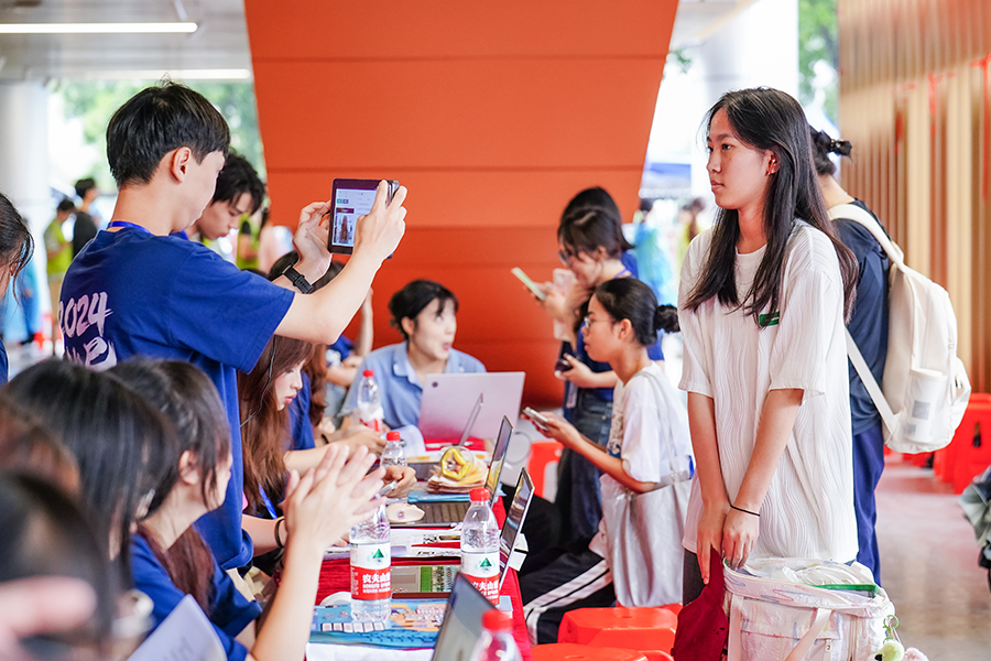 虽然天气多变,步入校园,目光所及之处,是为新生服务的广商师生,他们忙碌而温馨的身影,承载着广商对新生满满的爱意,处处都能看到醒目的迎新指引,热情的安保人员、志愿者用微笑迎接着每位新生。学校在南北校区分别设置新生报到处与咨询处,新生在各学院迎新工作人员的指导下快速完成了身份验证、查验通知书等工作,严谨、高效、到位的服务,让新生和家长的体验感直接拉满。志愿者们来回穿梭于校门口、宿舍与报到点之间,协助新生完成各项报到手续,耐心地解答各种问题,充分展现了广商的热情周到与人文关怀。