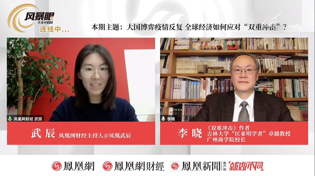 4月2日,凤凰网《风暴眼》独家连线我校校长、“长江学者”特聘教授、著名经济学家、《双重冲击》作者李晓教授。双方围绕“大国博弈、疫情反复:全球经济如何应对‘双重冲击’?”主题进行了深度对话。本场对话由凤凰网财经主持人武辰主持,通过凤凰网财经视频号、微博、风直播等公共媒体全网直播,各平台观众累计超过60万人次。