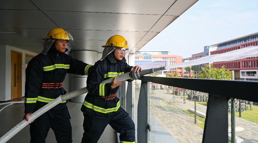 消防救援疏散应急演练以图书馆和第八教学楼发生火情为背景。随着急促的消防警报声响起,现场指挥立即下达启动消防应急疏散预案的指令,各应急小组工作人员迅速就位开展人员疏散救援行动,组织学生用湿毛巾、低头弯腰,迅速疏散逃生。由于“火势较大”,现场工作人员拨打“119”请求消防救援队到场支援灭火救援行动;同时,在消防疏散演练中还模拟了一名受伤学生在疏散途中下落不明未到达安全区域的场景,专业消防救援队和“120”急救中心人员马上到场协助实施救援。最后,在校地相关部门的紧密协同配合下,“火灾”得到有效控制,全体师生被安全疏散到指定区域。