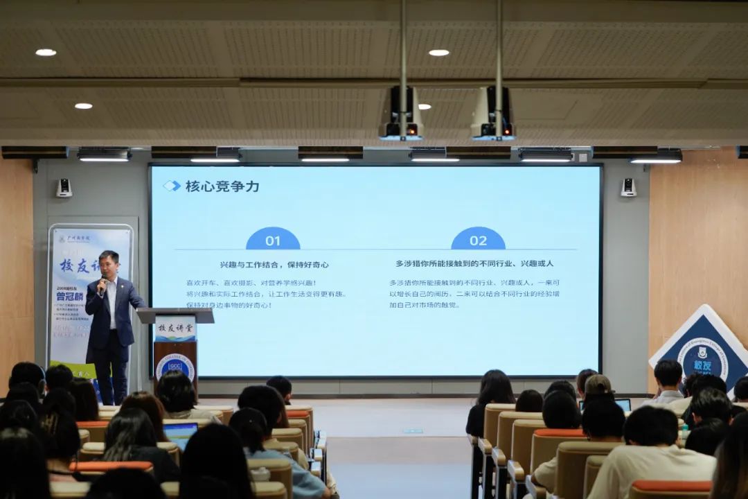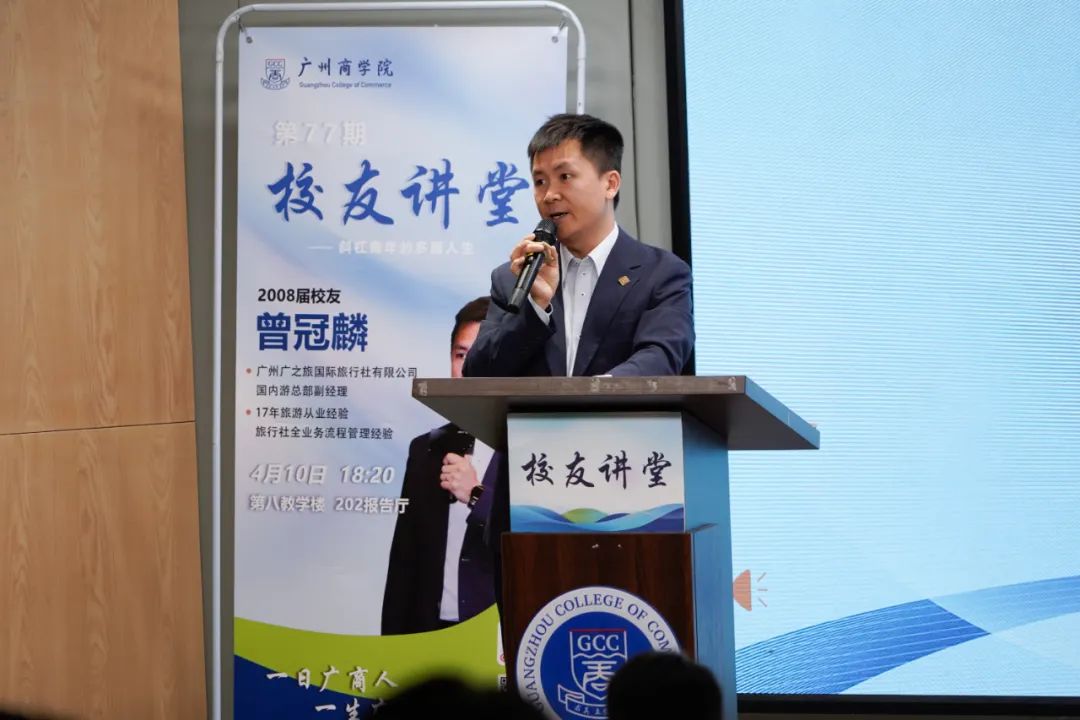 斜杠之路,兴趣融合,多元探索,能力进阶。4月10日晚,第77期校友讲堂在八教202报告厅成功举行,邀请2008届校友、广州广之旅国际旅行社股份有限公司国内游总部副经理曾冠麟回到母校,分享个人成长历程,引导广商学子更好地进行职业规划。学校校友会执行会长、校友办主任、品牌宣传部部长翁楚歆老师,校友办全体老师以及各学院师生代表线上线下520余人参加本次活动。