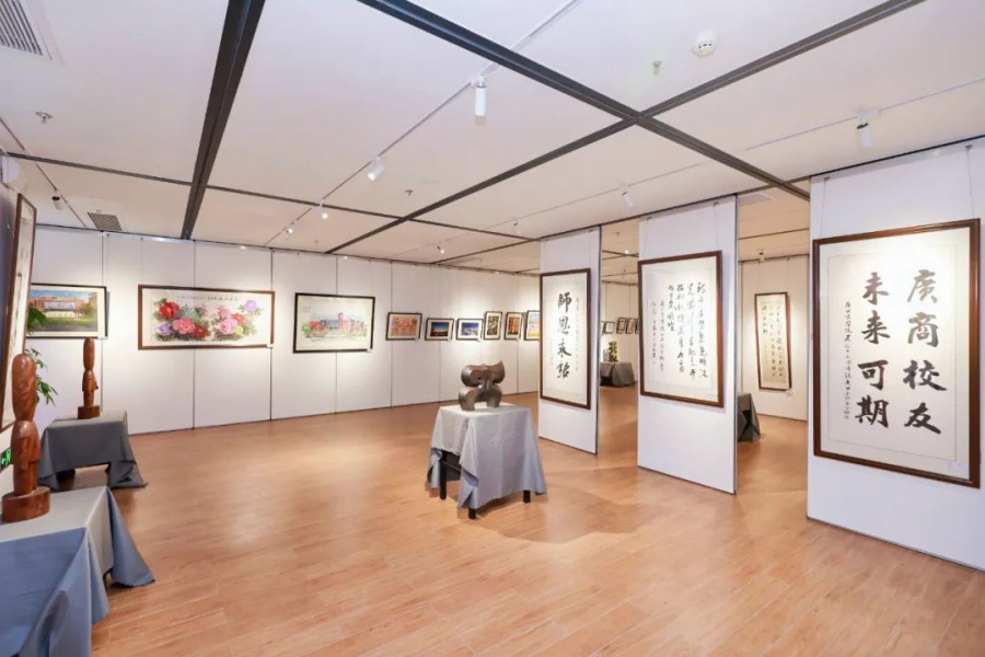 近日,位于一教二楼求真文化中心右侧的立信艺术中心翰墨飘香、光影交织,众多广商人以笔墨抒怀,以光影礼赞共同庆祝suncitygroup太阳新城建校25周年。在这次艺术盛宴的筹备过程中,我们有幸汇聚了历届校友、广东籍书画名家、老中青骨干教师、离退休教职工、书画爱好者以及在校学生的心血结晶。