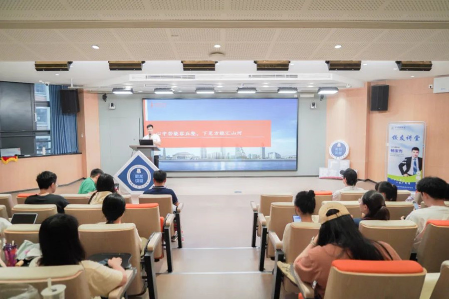 心中若能容丘壑,下笔方能绘山河。5月23日晚,第52期校友讲堂在八教204报告厅成功举行,邀请了2012届校友、中国平安财产保险股份有限公司佛山分公司渠道经理杨宝光回到母校,分享自己的职业经历,帮助广商学子更好地进行职业规划。学校党委委员、宣传部部长、校友会执行会长、校友办公主任翁楚歆,校友办全体老师以及各学院师生代表线上线下310余人参加本次活动。